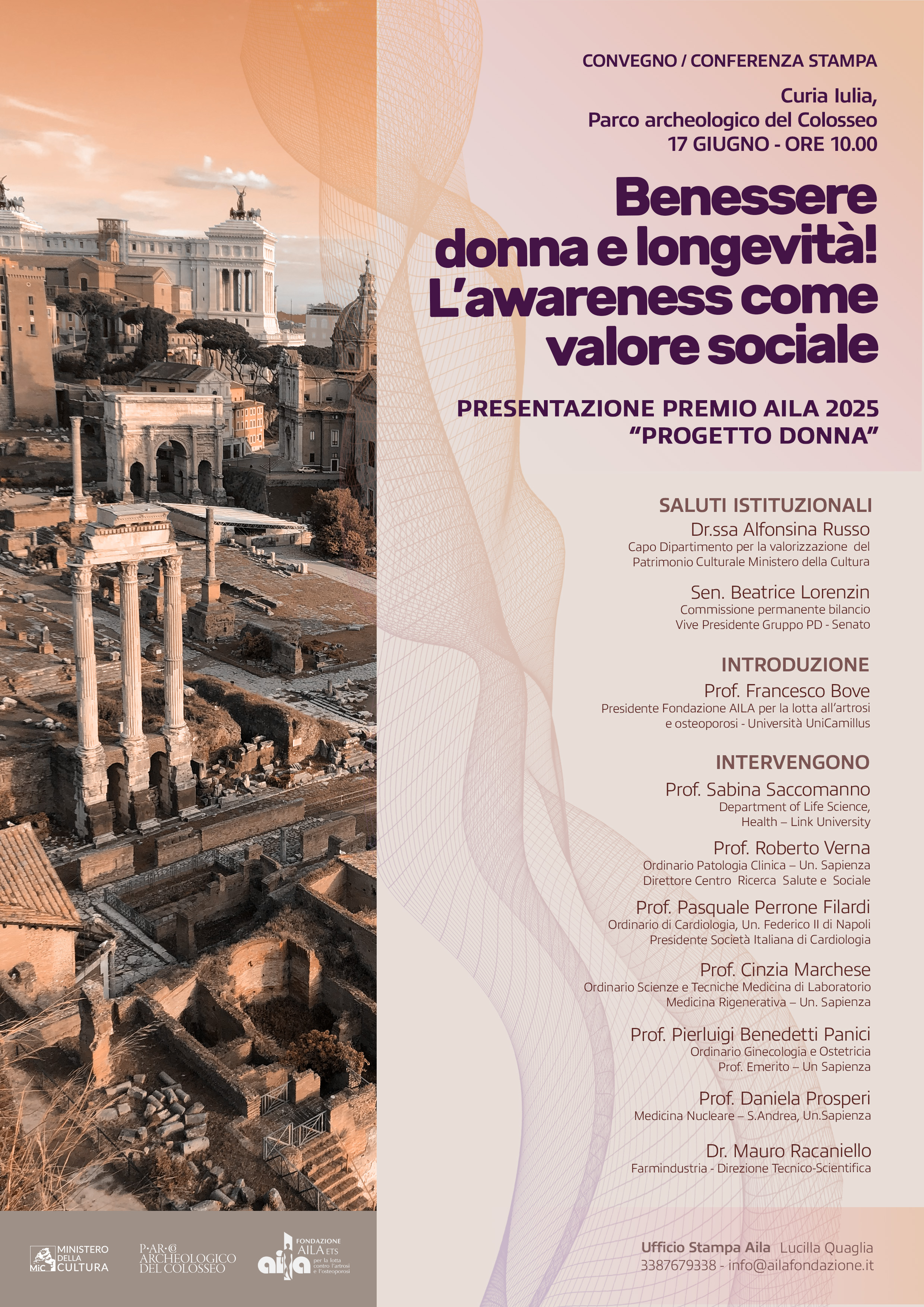 L’iniziativa, di grande attualità per l’invecchiamento della popolazione, primato del nostro Paese con una popolazione over 65 di circa il 26% secondo le ultime note ISTAT, si colloca nell’ambito delle attività promosse da AILA – Fondazione per la lotta all’artrosi e all’osteoporosi, presieduta dal Prof. Francesco Bove - in occasione della presentazione del Premio “Progetto Donna”, che verrà assegnato il 23 giugno 2025 al Tempio di Venere, un evento volto a valorizzare l’impegno e l’innovazione al femminile nei settori della salute, della ricerca e del benessere.Il convegno si propone come un’occasione unica di confronto scientifico e culturale sul tema del benessere femminile e della longevità, promuovendo una nuova consapevolezza collettiva sull’importanza della prevenzione, della ricerca e della valorizzazione della salute della donna in tutte le fasi della vita.... continua